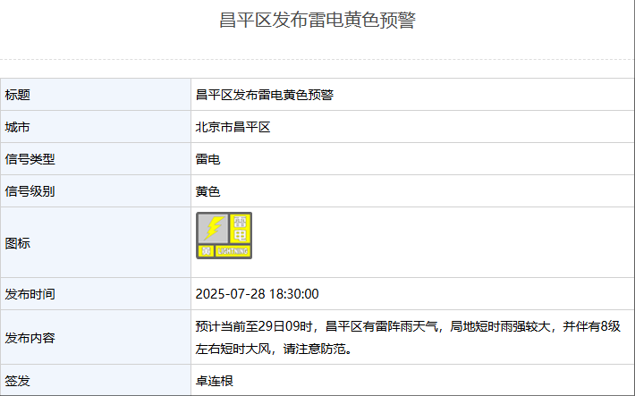 预计当前至29日09时,昌平区有雷阵雨天气,局地短时雨强较大,并伴有8级左右短时大风,请注意防范。