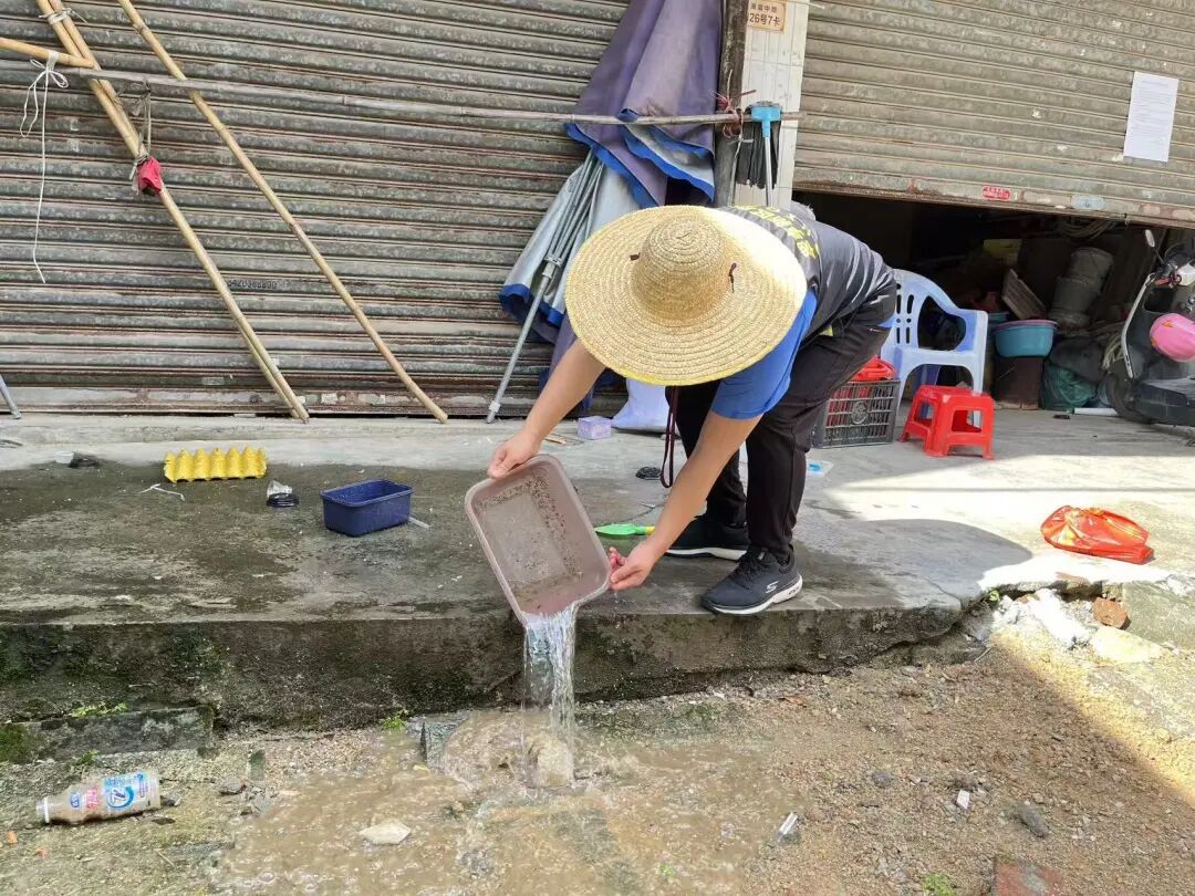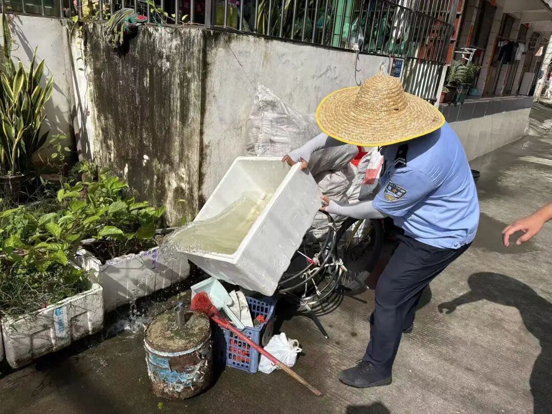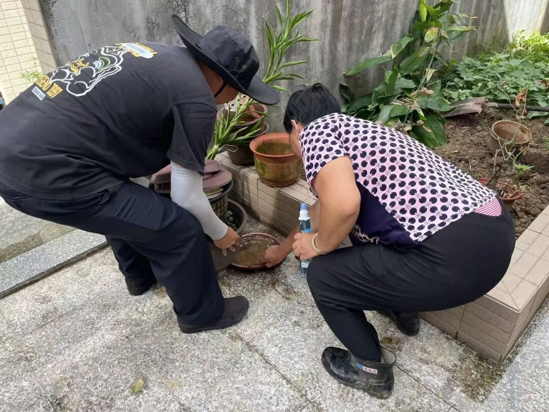 工作小组以“清积水、灭成蚊、除孳源”为重点,检查阳台花盆底、窗台凹槽等易积水区域,帮助居民倾倒积水,彻底铲除蚊虫孳生环境。