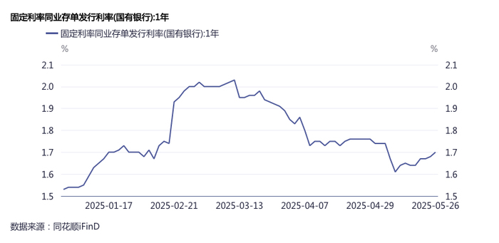 不过,期间同业存单利率却并未出现下行。同花顺ifnd数据显示,在存款利率和贷款利率下调之前国有大行一年期同业存单发行利率为1.64%,“双降”后同业存单利率不降反升,5月26日升至1.7%,其他类型银行存单发行利率也呈现类似走势。